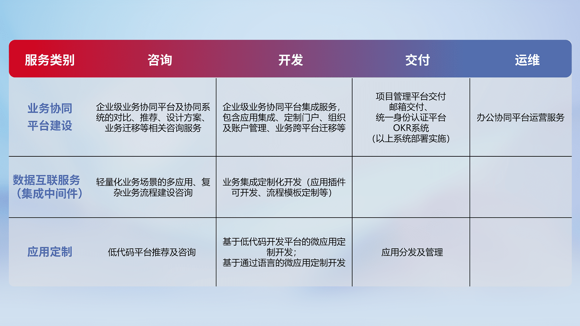 针对钉钉、、企微、、IDaas等平台级产品提供产品的规划、、、、方案、、、交付、、、、定制化开发等服务,,,,实现如统一协同办公、、、、智能客户服务、、混合会议管理、、智能数据查询、、、、等业务场景,,,,实现数字化转型。。